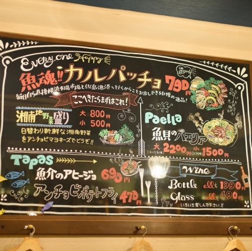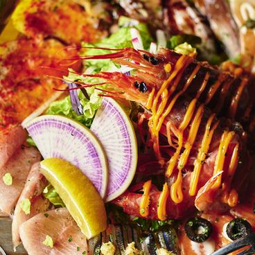 当店の名物といえばこれ!「魚魂!カルパッチョ」は見た目にも豪華な逸品です。朝どれ新鮮なお魚を市場から直送で仕入れし、その日最高なものを盛り合わせにしご提供します。各魚介に合わせて味付けも変えています。何の魚があるかはその日のお楽しみ♪各種宴会コースでもご提供いたします!