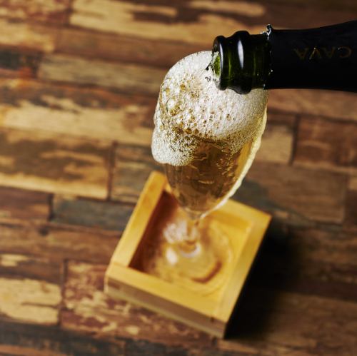 乾杯にはコレ♪枡の中まで注ぎきるはなたれ名物「こぼれスパークリング」!朝獲れ鮮魚と相性抜群◎
